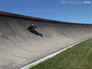 После того как мы провели несколько часов на дорожном курсе, попали в овальную часть Contidrom, чтобы проверить устойчивость ContiSportAttack 2 на высоких скоростях. Эта часть теста меня обеспокоила и взволновала от первого взгляда на невероятно крутой подъем. Внешней край бетонной поверхности наклонен на 80 градусов! Нам сказали, что если мы поедем слишком быстро, перегрузки могут привести к потемнению в глазах. В течение трех кругов у меня был Triumph 675 и на краю овала Contidrom шины ContiSportAttack 2 были стабильны словно скала.